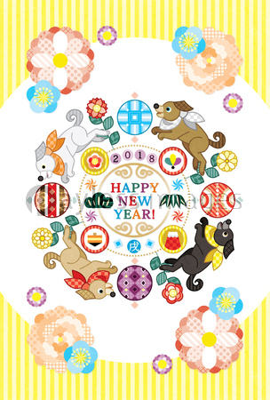 2018年戌年完成年賀状テンプレート 花と毬と犬の輪カラフル Happynewyear ストックフォトの定額制ペイレスイメージズ